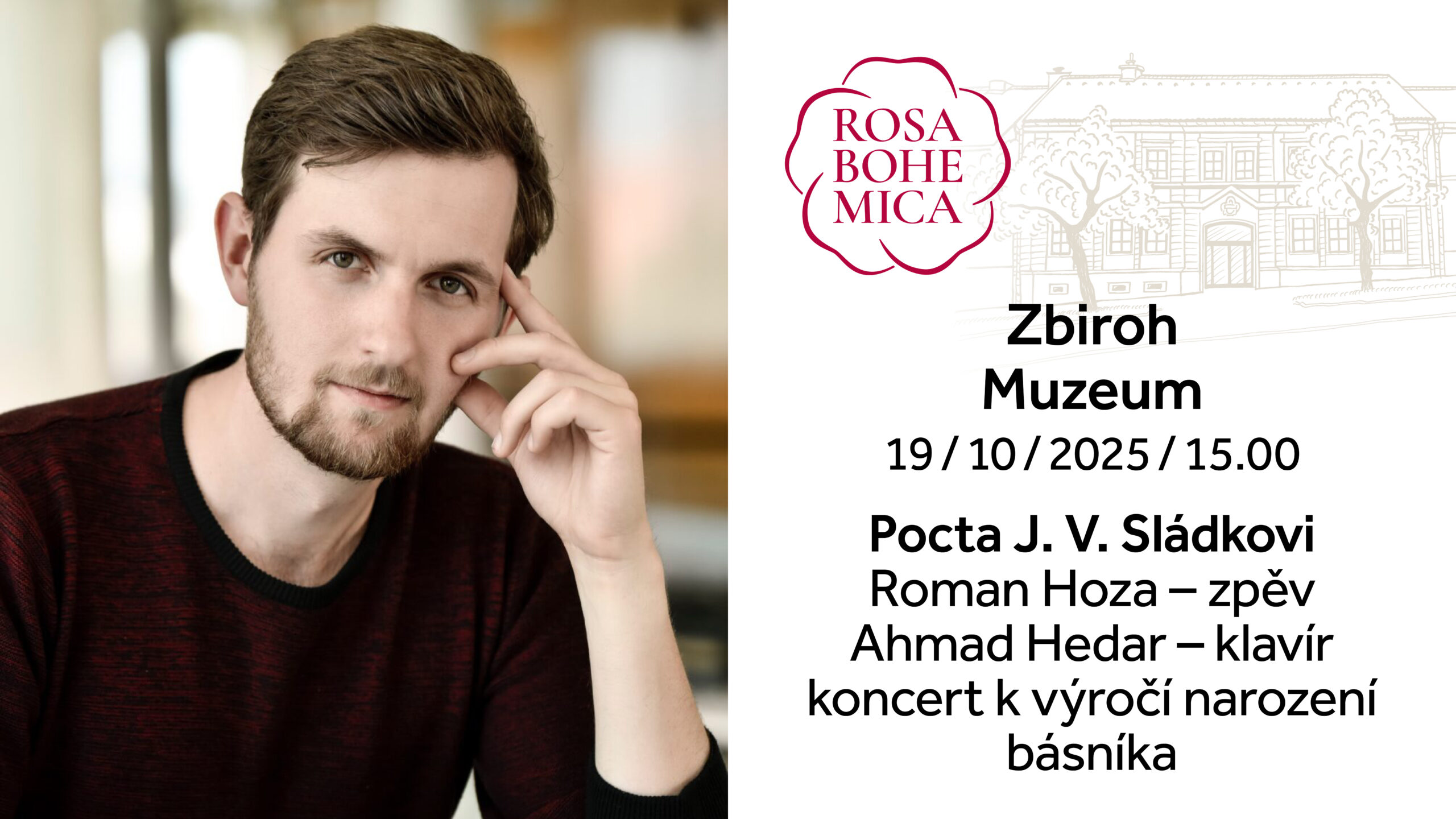 Nadcházející akce: Zbiroh / Muzeum Josefa Václava Sládka / Pocta J. V. Sládkovi / Roman Hoza–zpěv / Ahmad Hedar–klavír / písňový recitál ke 180 letům výročí narození básníka / 19. 10. / 2025 / 15.00